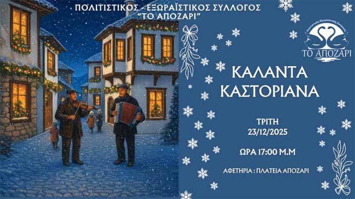 Ο Πολιτιστικός Εξωραϊστικός Σύλλογος «Το Απόζαρι » για άλλη μια φορά σας προσκαλεί να αναβιώσουμε μαζί το έθιμο των Καστοριανών Καλάντων, πόρτα πόρτα, με μελωδίες, ευχές και χριστουγεννιάτικη ζεστασιά.