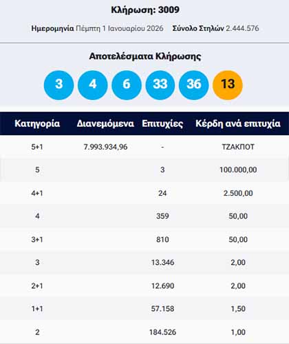 Τζακ-ποτ σημειώθηκε στην πρώτη κατηγορία (5+1) στην κλήρωση του Τζόκερ της Πέμπτης 1 Ιανουαρίου 2025