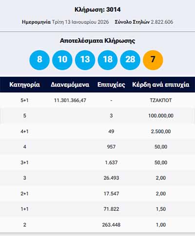 Οι τυχεροί αριθμοί είναι οι: 8, 10, 13, 18, 28