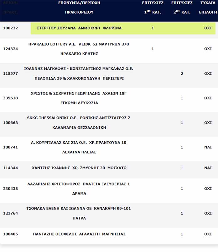 Επίσης, εννιά (9) τυχερά δελτία βρέθηκαν στη 2η κατηγορία (5), τα οποία κερδίζουν το ποσό των €100.000,00 για κάθε επιτυχία.
