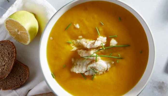 - Πολτοποιούμε τη σούπα με το ραβδομπλέντερ ή σε δόσεις στον πολυκόφτη και μοιράζουμε στα πιάτα μαζί με το ψαχνό ψαριού.
