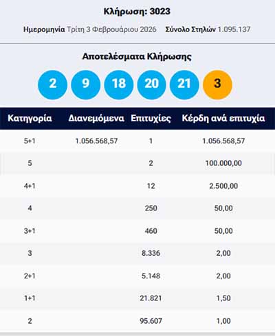 Στην πρώτη κατηγορία (5+1) βρέθηκε 1 στήλη που κερδίζει 1.056.568,57 ευρώ στην κλήρωση του Τζόκερ της Τρίτη 3 Φεβρουαρίου 2025