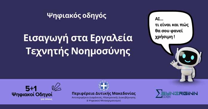 Συνεχίζοντας τη σειρά «5+1 Ψηφιακοί Οδηγοί για Όλους», η Περιφέρεια Δυτικής Μακεδονίας παρουσιάζει τον 4ο θεματικό ψηφιακό οδηγό με τίτλο «Εισαγωγή στα Εργαλεία Τεχνητής Νοημοσύνης».