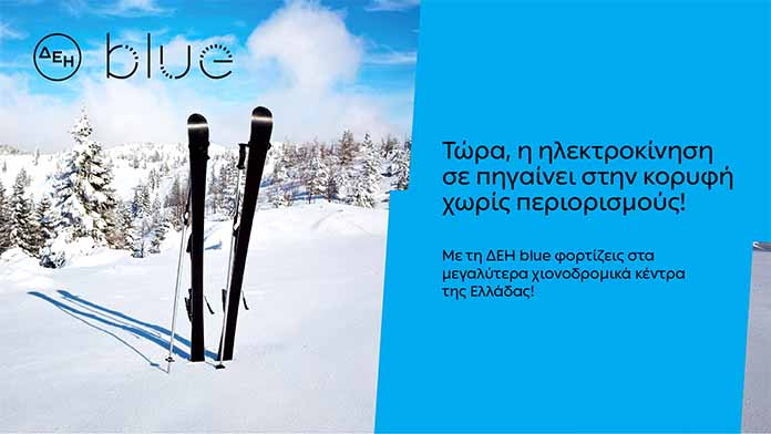 Συνολικά 54 σημεία φόρτισης λειτουργούν στα επτά μεγαλύτερα χιονοδρομικά κέντρα της χώρας, στο πλαίσιο ανάπτυξης του δημόσια προσβάσιμου δικτύου φόρτισης της ΔΕΗ blue, καθώς και της ενίσχυσης των υποδομών ηλεκτροκίνησης σε ορεινούς και χειμερινούς δημοφιλείς προορισμούς. Η επέκταση του δικτύου αφορά τα χιονοδρομικά κέντρα Παρνασσού, Βόρα, Βασιλίτσας, Ζήρειας, Καλαβρύτων, 3-5 Πηγαδιών και Σελίου.