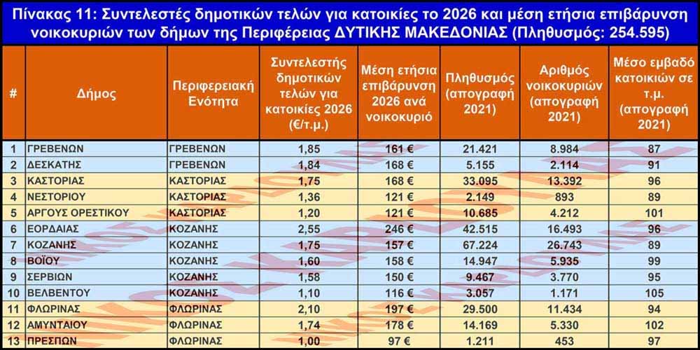 Στην Περιφέρεια Δυτικής Μακεδονίας τον υψηλότερο συντελεστή δημοτικών τελών για κατοικίες ανά τ.μ. το 2026 έχει ο Δ. Εορδαίας με 2,55 € και ακολουθούν οι δήμοι Φλώρινας (2,10 €), Γρεβενών (1,85 €), Δεσκάτης (1,84 €), Καστοριάς και Κοζάνης (και οι δύο 1,75 €) και Αμυνταίου (1,74 €), ενώ το χαμηλότερο έχει ο Δ. Πρεσπών με 1,00 € και ακολουθούν οι δήμοι Βελβεντού (1,10€), Άργους Ορεστικού (1,20 €), Νεστορίου (1,36 €), Σερβίων (1,58 €) και Βοΐου (1,60 €).
