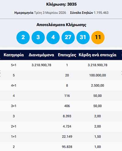 Στην πρώτη κατηγορία (5+1) βρέθηκε 1 στήλη που κερδίζει 3.218.900,78 ευρώ στην κλήρωση του Τζόκερ της Τρίτης 3 Μαρτίου 2025