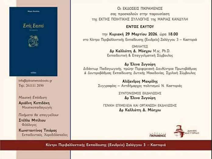 Οι Εκδόσεις Πικραμένος προσκαλούν το κοινό στην παρουσίαση της έκτης ποιητικής συλλογής της Μαρίας Κανδύλη, με τίτλο «Εντός Εαυτού», την Κυριακή 29 Μαρτίου 2026 και ώρα 18:00, στο Κέντρο Περιβαλλοντικής Εκπαίδευσης (Ενυδρείο).