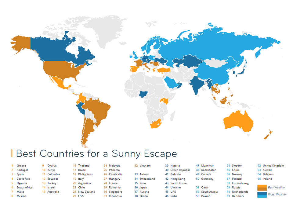Σε οποιονδήποτε από αυτούς τους δέκα πρώτους προορισμούς, οι θετικές εκτιμήσεις για το κλίμα και τις καιρικές συνθήκες ανήλθαν τουλάχιστον στο 91%, δηλαδή κατά 30% πάνω από τον παγκόσμιο μέσο όρο.